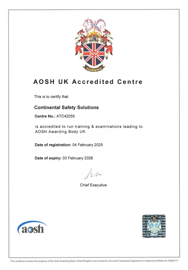 AOSh is a prominent accreditation body that specializes in the certification of health, safety, and environmental qualifications. Recognized for its rigorous standards, AOSh provides industry-leading certifications for individuals and organizations in the HSE (Health, Safety, and Environmental) sector. By partnering with AOSh, Continental Safety Solutions ensures that its safety courses are not only of the highest quality but also internationally recognized, helping professionals enhance their safety knowledge and skills in accordance with global best practices.